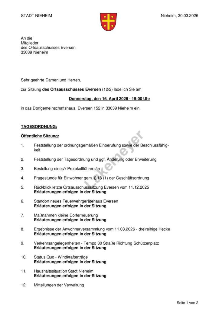 Am 16.04.2026 um 19 Uhr findet die nächste Ortsausschusssitzung Eversen statt. Um zahlreiches Erscheinen wird gebeten.