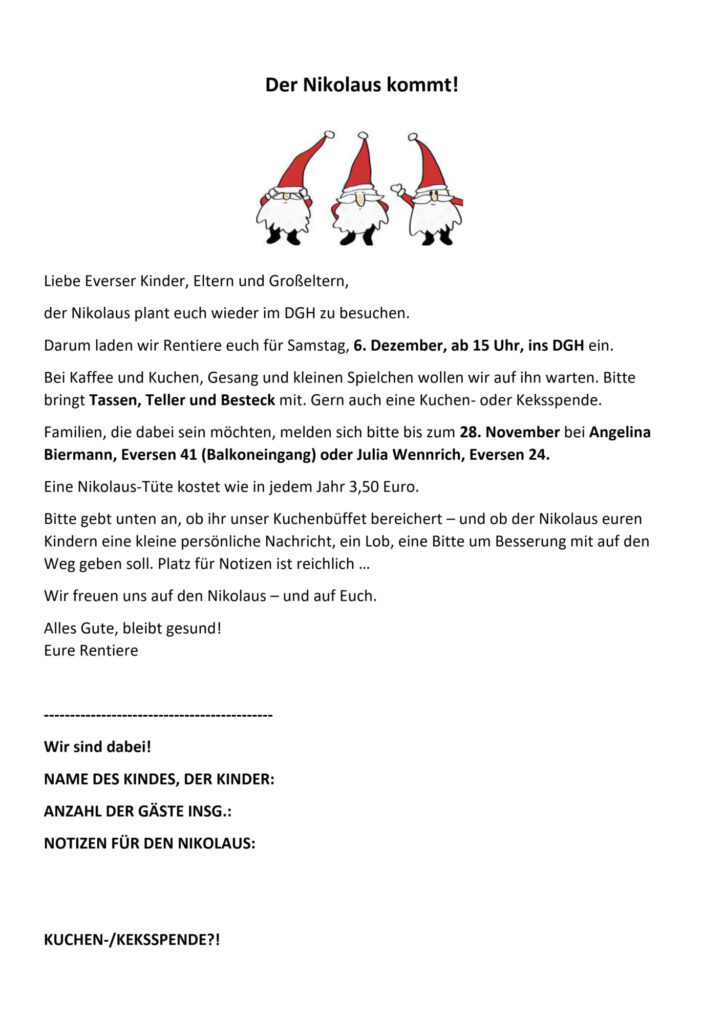 Am 6.12.2025 findet im DGH wieder eine Nikolausfeier statt.