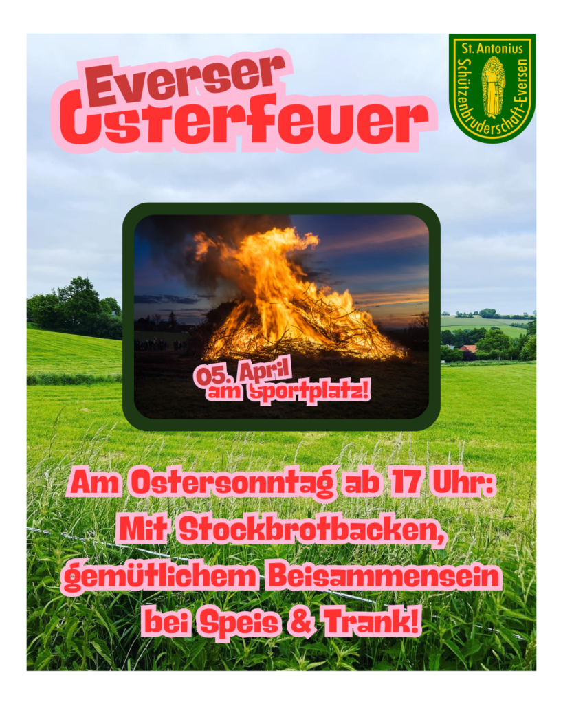 Wieder veranstalten wir traditionell das Abbrennen des Osterfeuers in Zusammenarbeit mit der Herrenmannschaft des VfL Eversen und unserer freiwilligen Feuerwehr, so ist für die Sicherheit, als auch für Speis und Trank bestens gesorgt.
